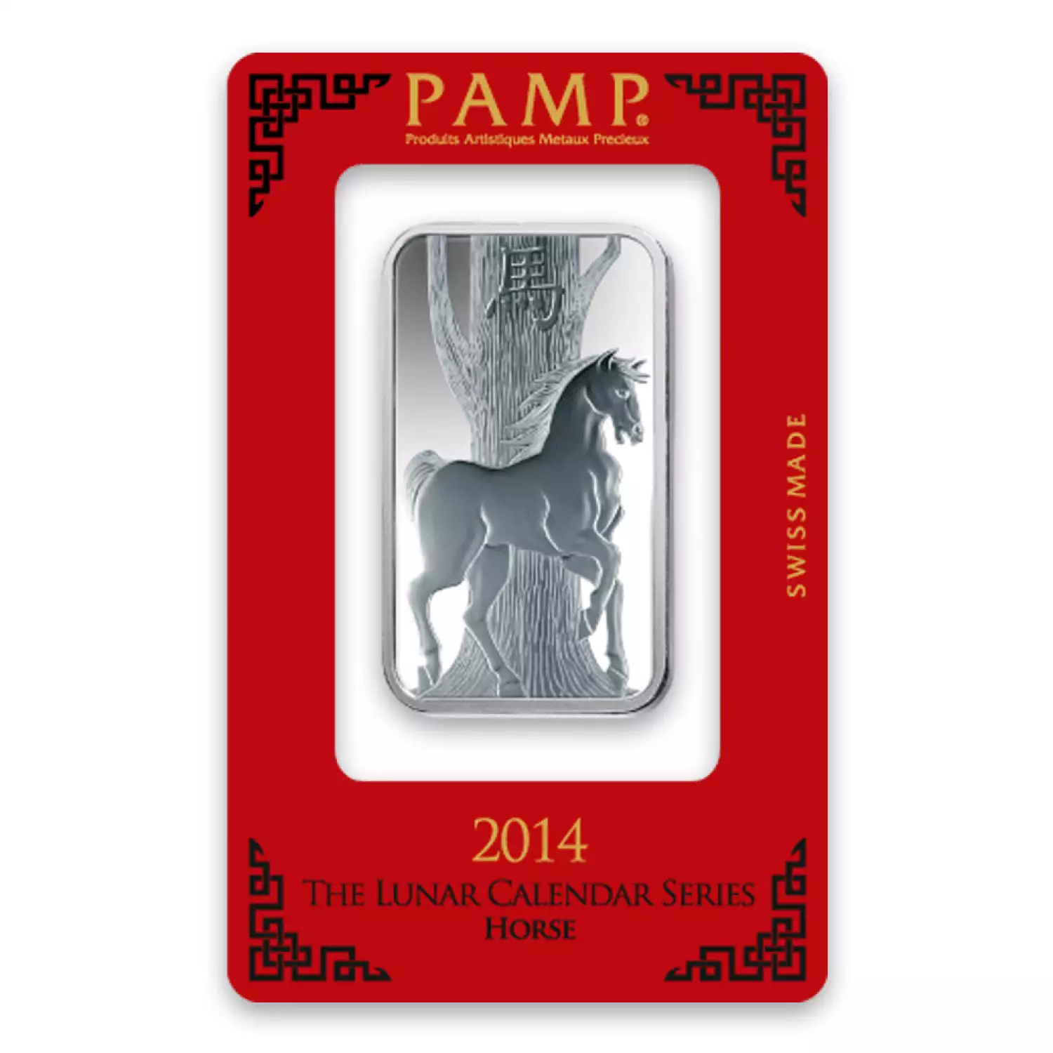 The 1oz PAMP Silver Bar - Lunar Horse is manufactured in Switzerland and is composed of 1 troy ounce of .999 pure silver. This beautiful silver bar features a horse design for the Chinese Zodiac series on the obverse.