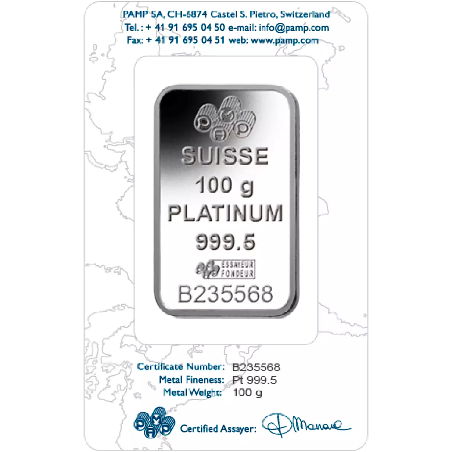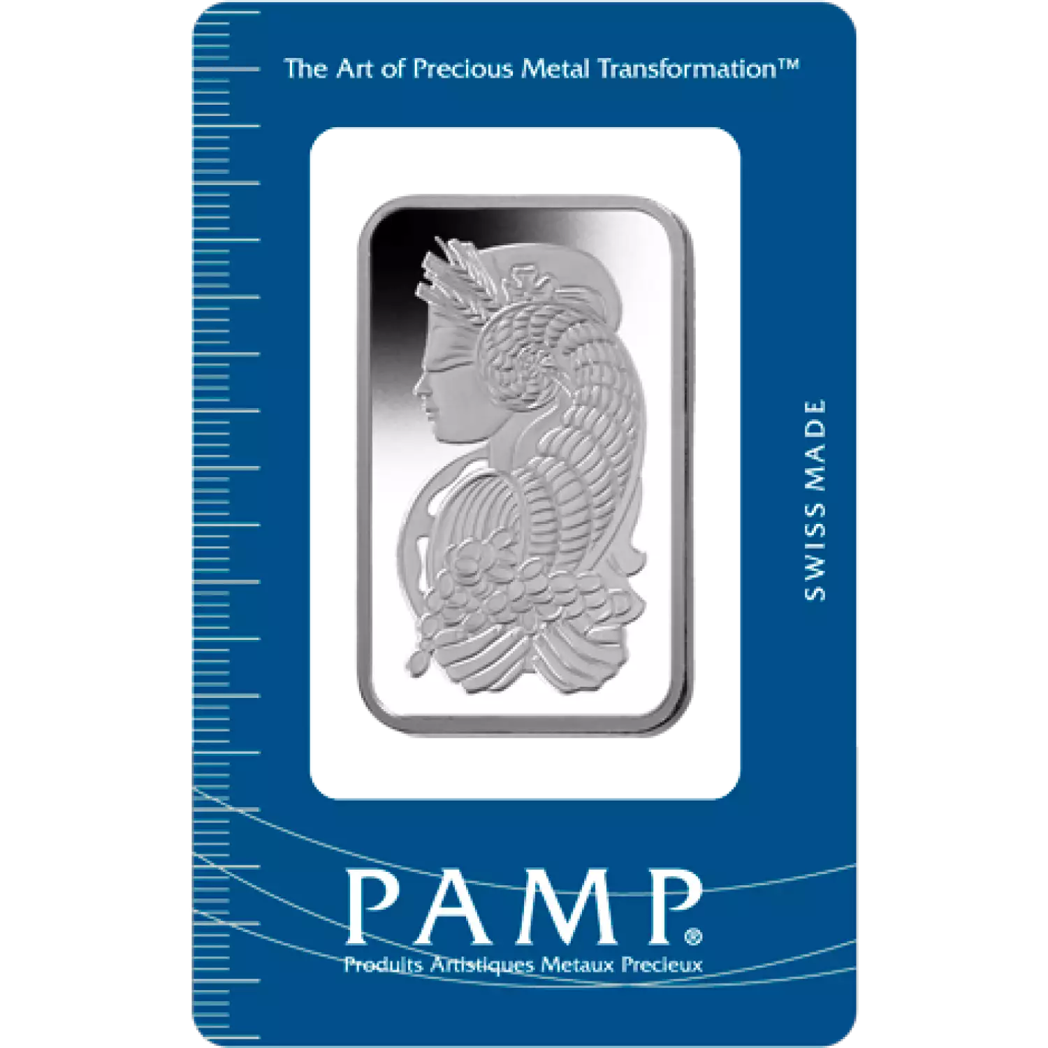 PAMP Suisse is the world’s leading independent refiner of precious metals. PAMP Platinum Bars are highly popular among investors and collectors for their pure platinum content and high-quality. Each 100g PAMP Platinum Bar – Fortuna is composed of 100 grams of .9995 fine platinum.