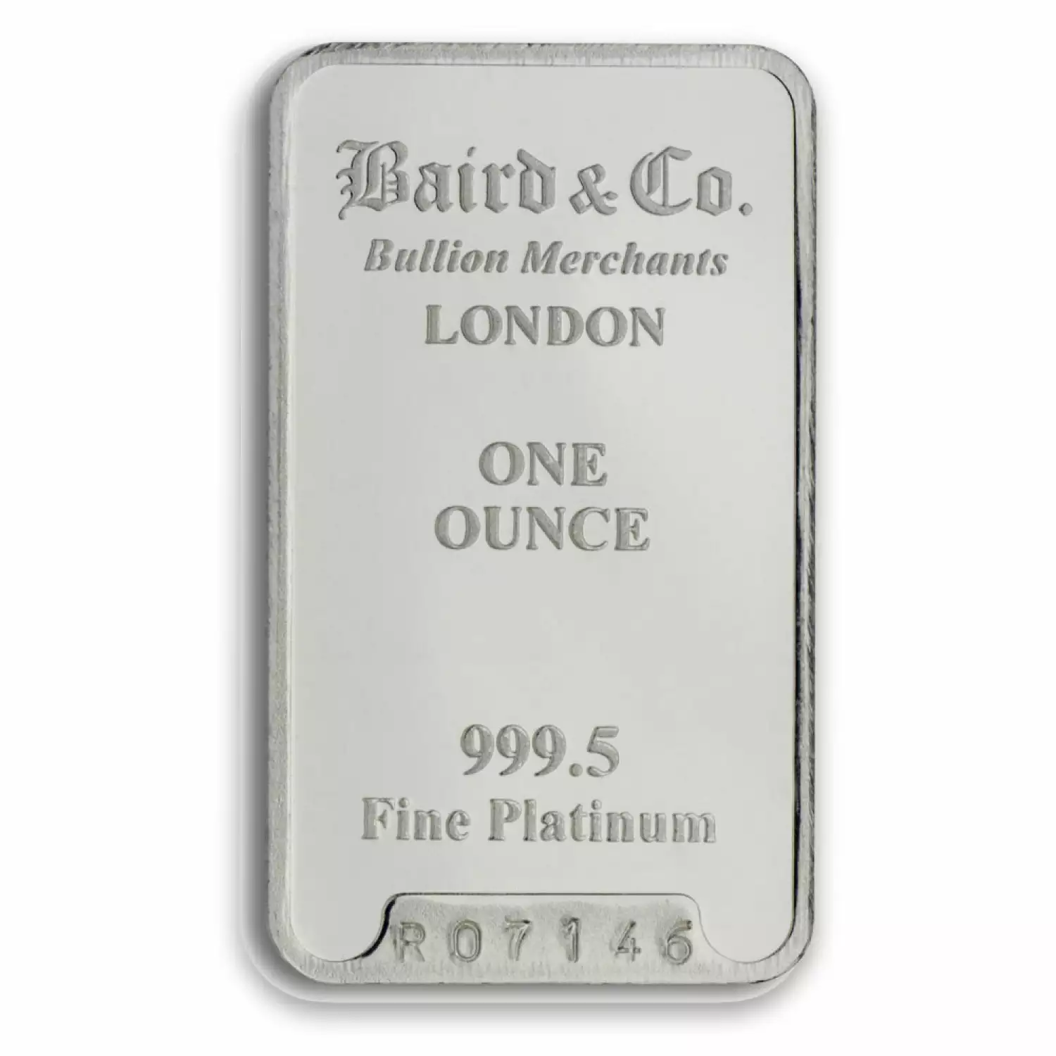 Platinum bars are available in three different types i.e. cast, minted or extruded. Manufactured by Baird & Co in the UK, each 1oz Baird & Co Platinum Minted Bar contains 1 oz of .9995 fine platinum. These stunning platinum bars appeal to both investors and collectors for their iconic designs. Platinum bars and platinum coins may tend to tarnish over time depending upon the environment they are stored.