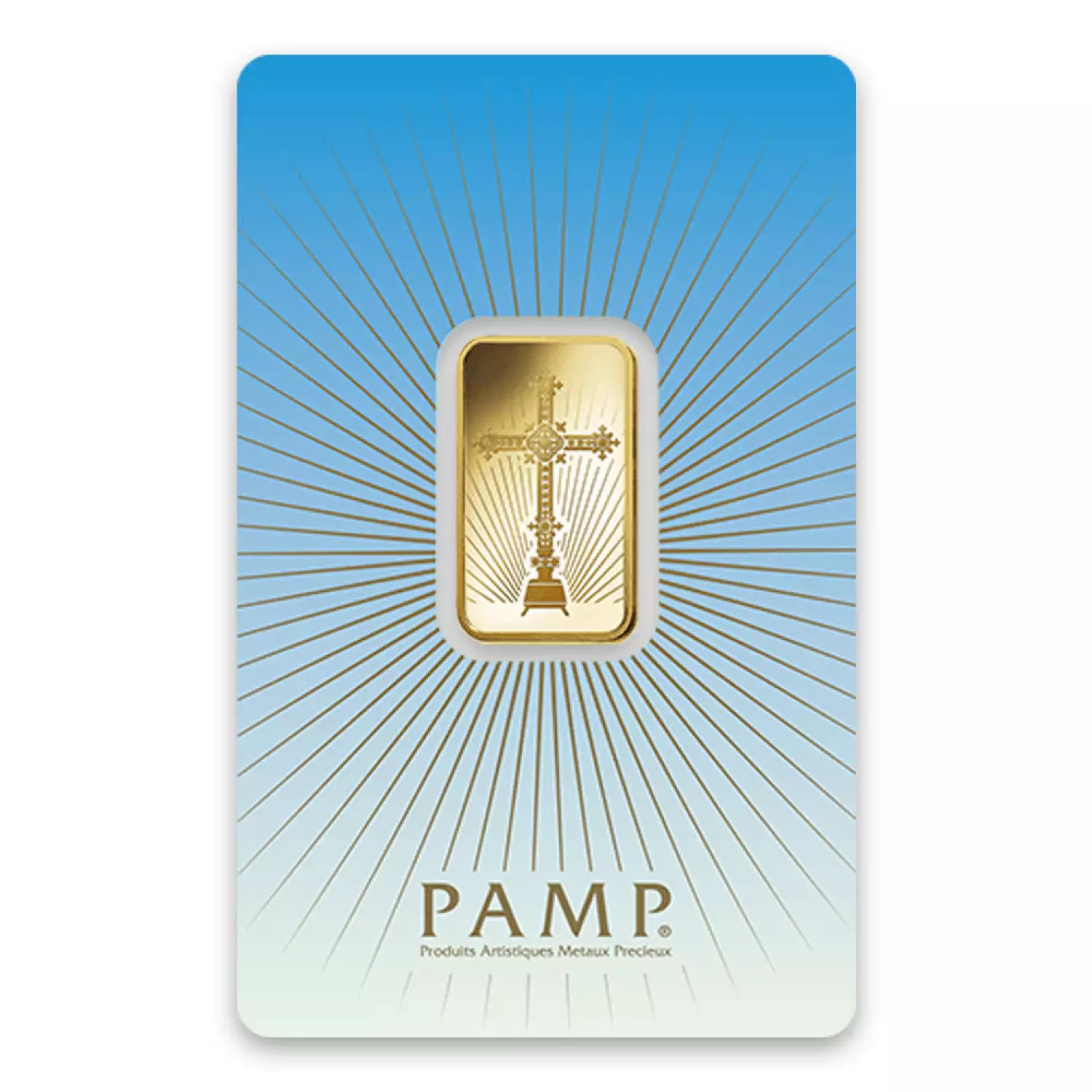 The 10g PAMP Gold Bar - Romanesque Cross exemplifies beauty through the depiction of classic religious symbols. The Obverse of the gold bar features a depiction of the Roman Cross on a pedestal with radiant beams of light portrayed in the background.