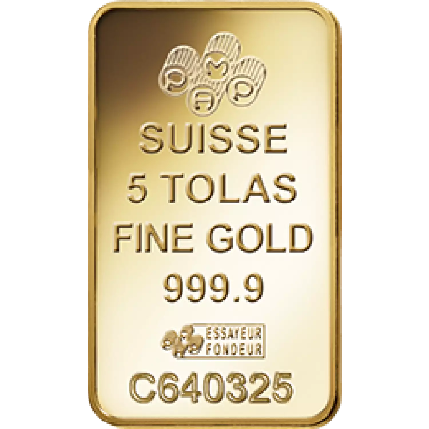The PAMP Suisse 5 Tola gold bar is more commonly found in Asian markets and tyically is most commonly found in India, but can be purchased worldwide. The tola is an ancient unit of measure for precious metals and 5 Tolas is equal to 1.875 troy ounces.