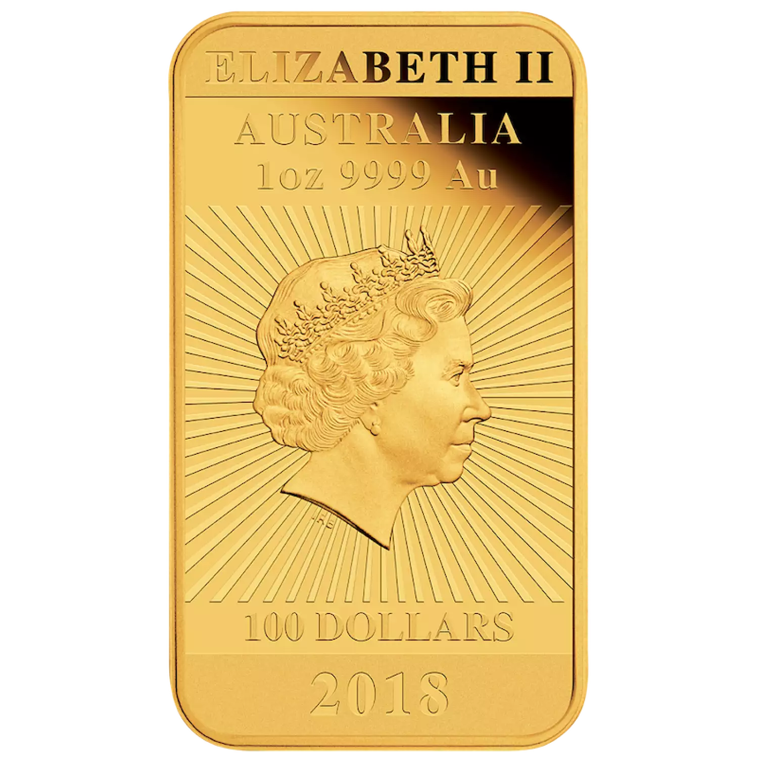 The 41.6mm x 24.6mm rectangular coin is struck from 1oz of 99.99% pure gold to our renowned proof standard combining a mirror-like polished background with delicately frosted relief.