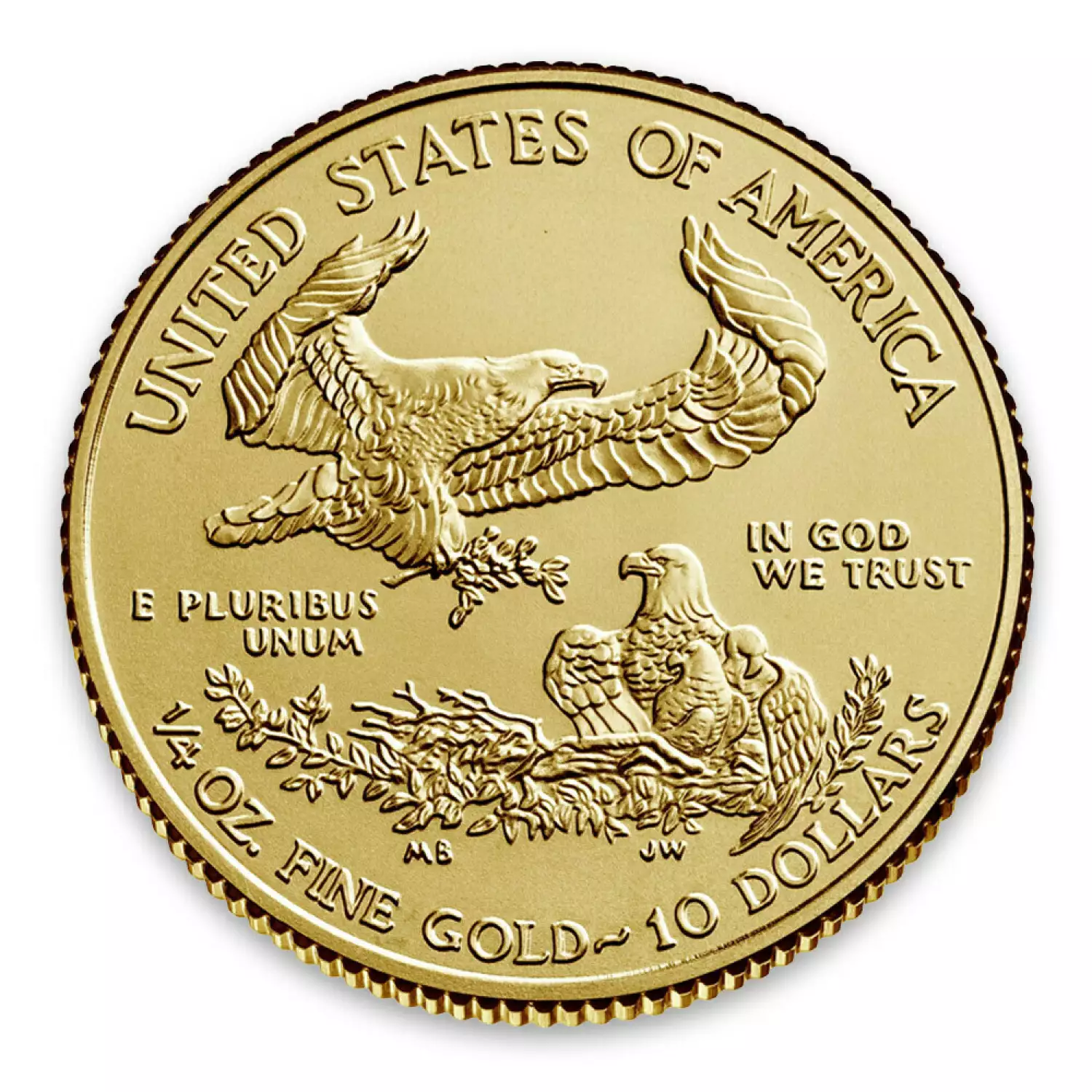 Once introduced in 1986, the American Gold Eagle became the most widely traded gold coin in the United States, surpassing both the Canadian Gold Maple Leaf and the Krugerrand. The 1/4 oz gold eagle is alloyed with gold, copper, and silver with an overall purity of 9167 (22kt) so the actual gold coin weighs more than 1/4oz given the additional silver and copper.