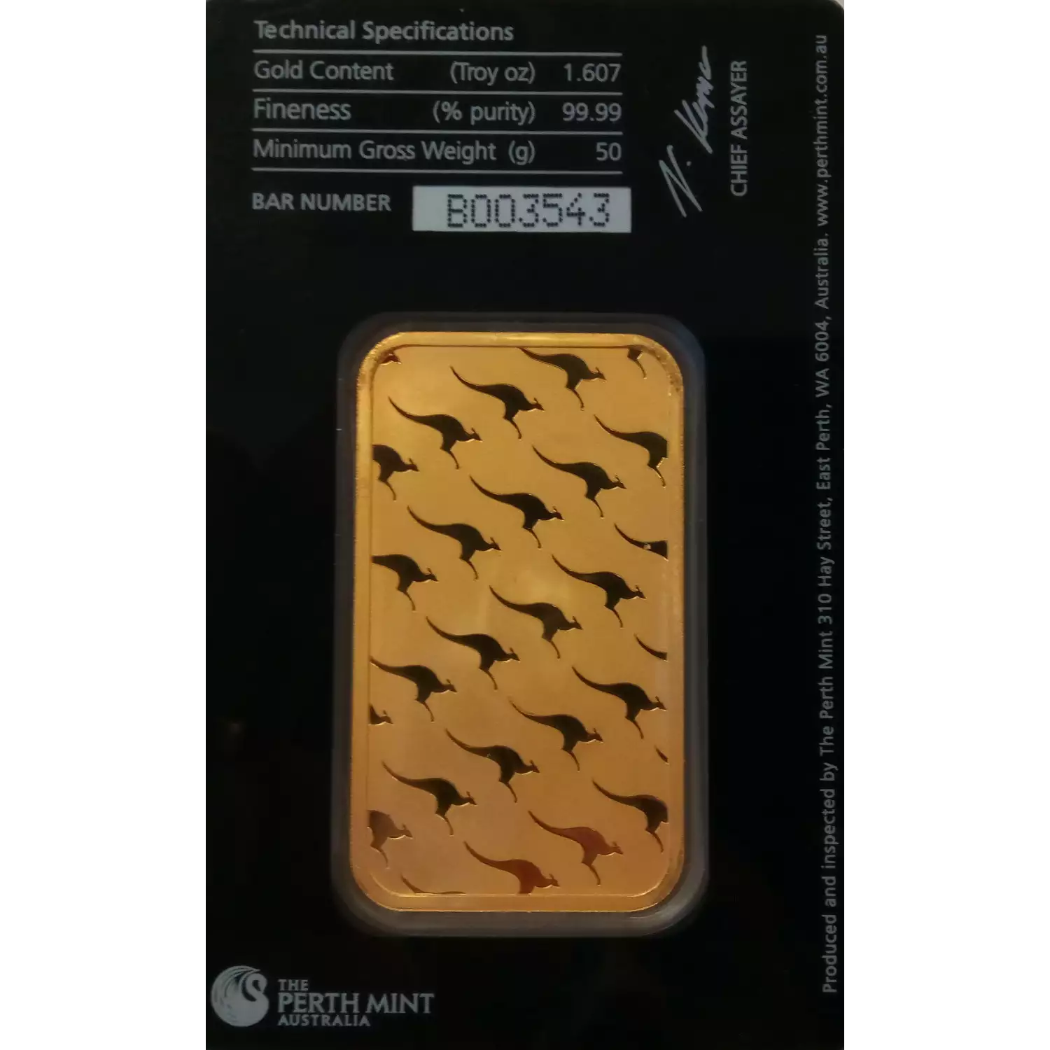 Each 50g Australian Perth Mint gold bar – minted contains 50 grams of .9999 fine gold.Each gold bar features the Perth Mint’s distinctive logo of a majestic swan along with weight and purity on the front. These gold bars are highly popular among investors and collectors for their high-quality.