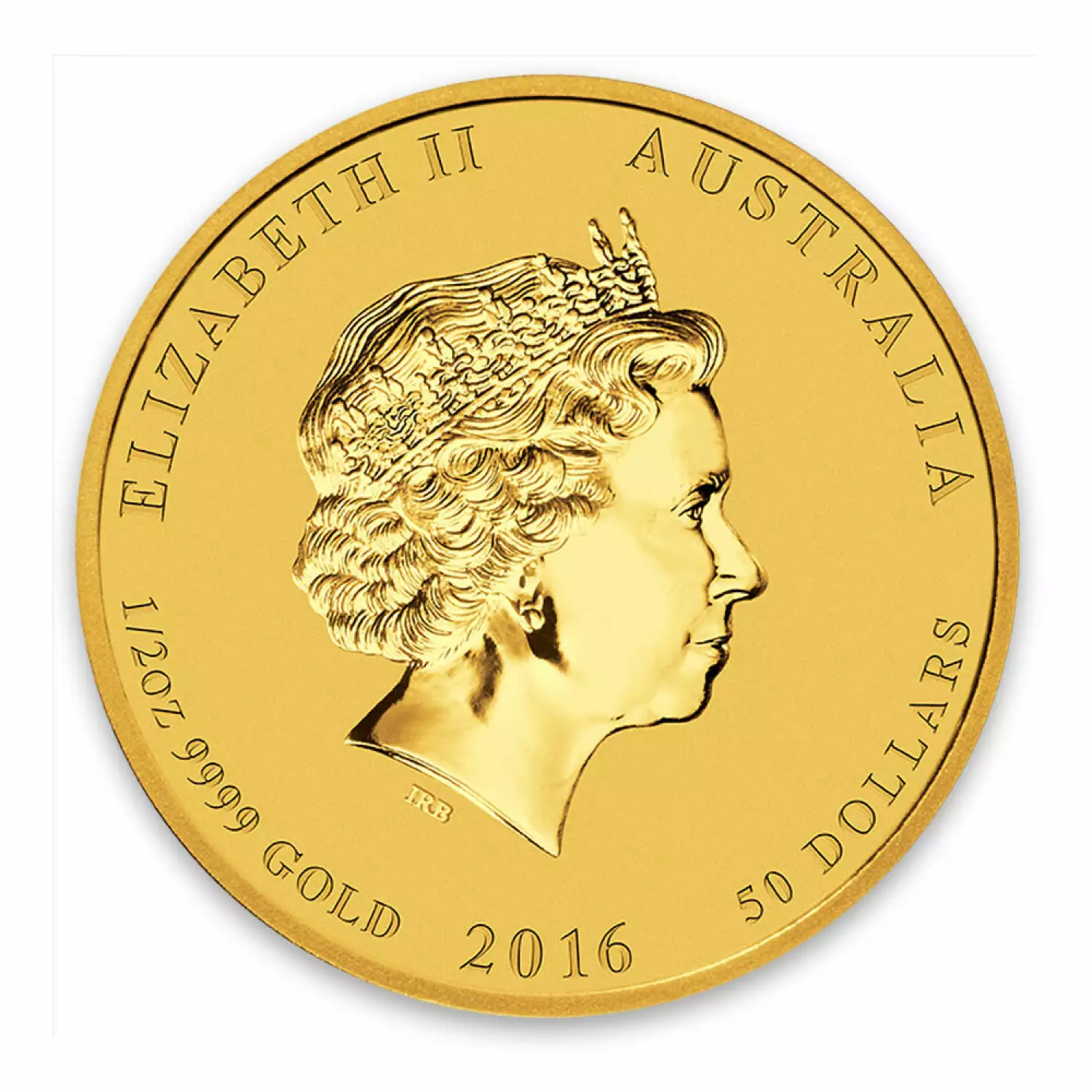 The 2016 ½ oz Australian Perth Mint Gold Lunar II: Year of the Monkey contains 1/10 troy oz of .9999 pure gold and has a face value of 50 AUD, backed by the government of Australia. The Obverse of the coin depicts the Ian Rank-Broadley likeness of Her Majesty Queen Elizabeth II. The Reverse of the coin depicts an adult monkey sitting on a branch of a peach tree.