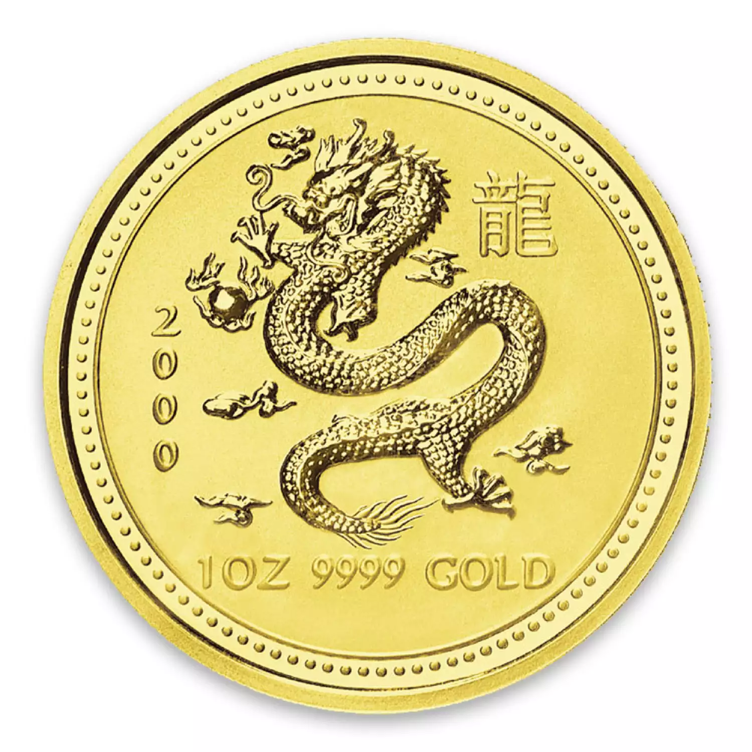The 2000 1 oz Australian Perth Mint Gold Lunar: Year of the Dragon is the fifth release of the Perth Mint's first Lunar Series and has a mintage of just 30,000 coins. The Obverse of the coin features the Ian Rank-Broadley effigy of Her Majesty Queen Elizabeth II. The Reverse depicts a traditional Chinese dragon, a long, scaled, serpentine creature with a "pearl of wisdom", designed by Tony Dean.