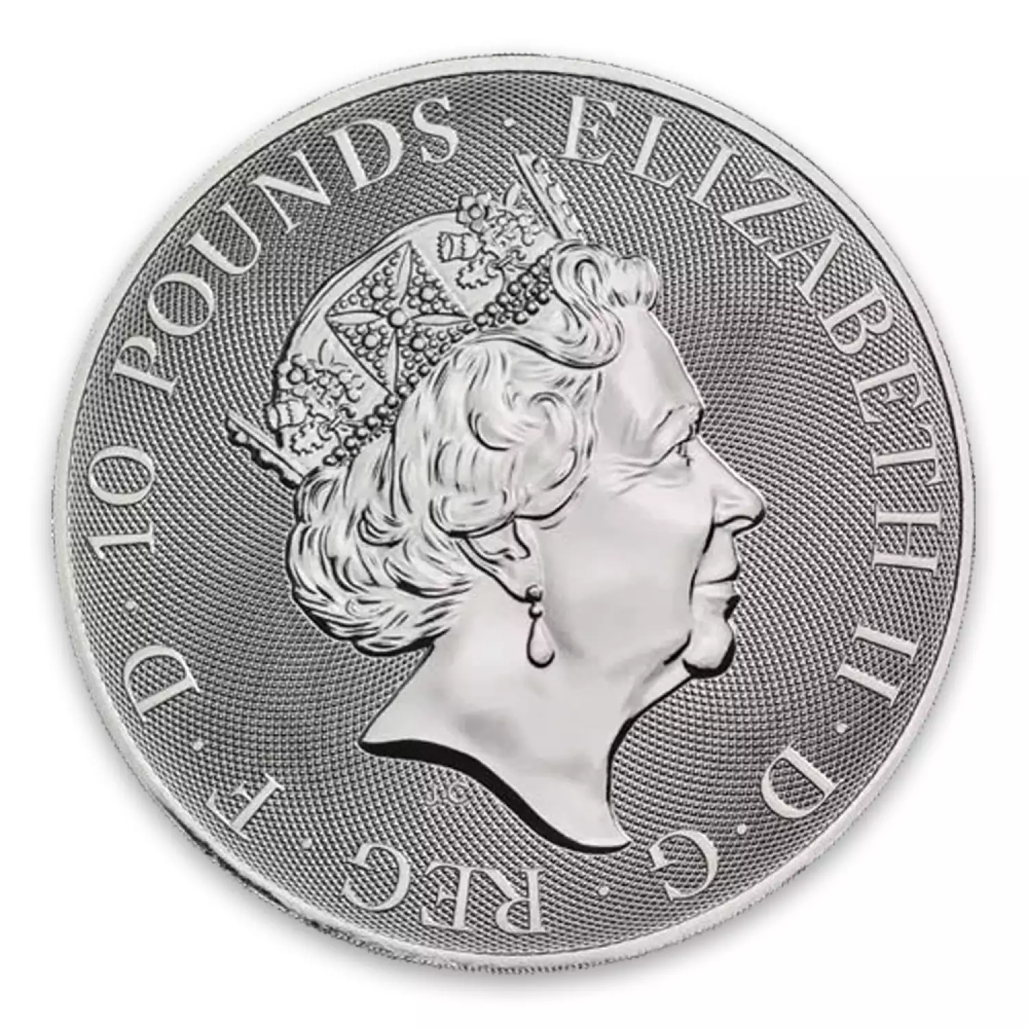 The 2022 10oz Britain Queen's Beasts: The White Greyhound is the 10th and final release in an exciting 10 coin series. The Britain Queen's Beasts celebrate the British Monarch and the centuries of fascinating heraldry. This silver coin contains 10 oz of .999 fine silver. The reverse the is facing the White Greyhound of Richmond along with the representative seal of the Tudors.