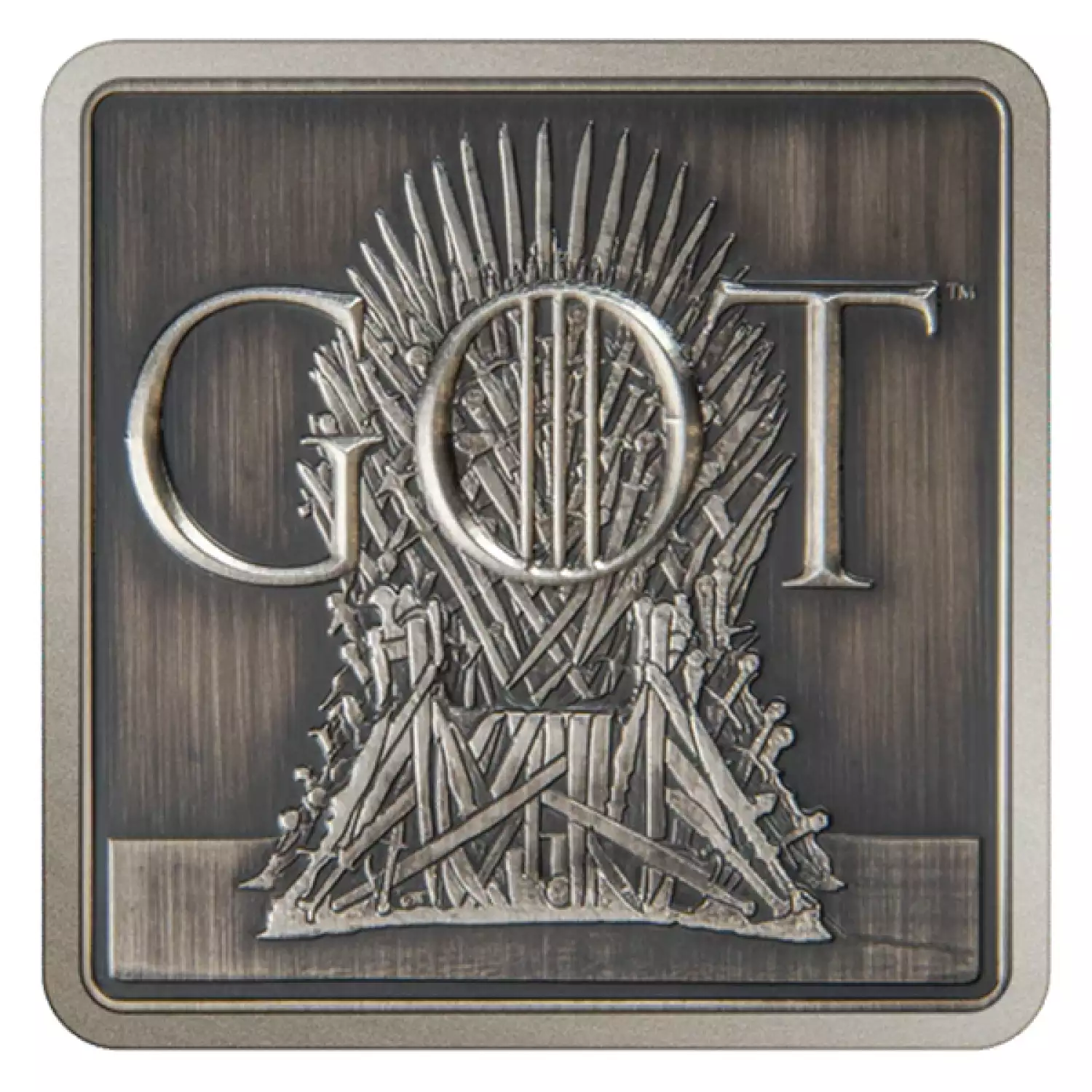 One side of the square medallion shows an engraving of the iconic Iron Throne and the GAME OF THRONES logo. The other side is also engraved, showcasing a close-up image of this symbol of conquest. The medallion has also been antiqued to provide an ancient look — fitting as the throne is made from steel swords of vanquished enemies.