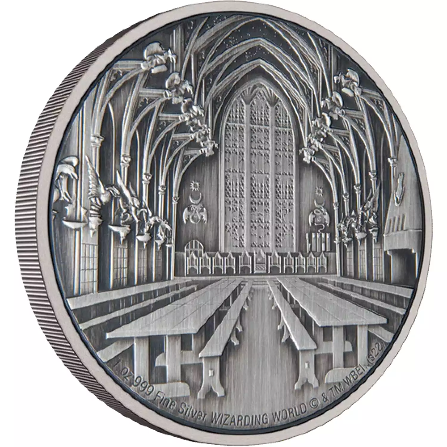 This 1oz silver coin features a fully engraved image of the Great Hall in the Hogwarts™ Castle from HARRY POTTER™. It has been antiqued and includes some relief to add extra charm to the design.
