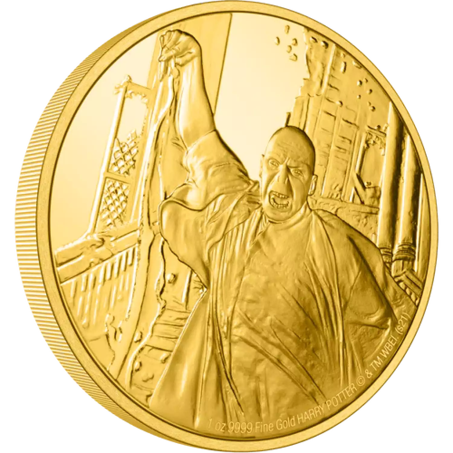 Arch enemy of Harry Potter, Lord Voldemort, features on this delicately engraved 1oz gold coin. It shows a menacing image of the Dark Lord casting a vicious spell in anger. The effigy of Her Majesty Queen Elizabeth II on the opposite side confirms the coin as legal tender.