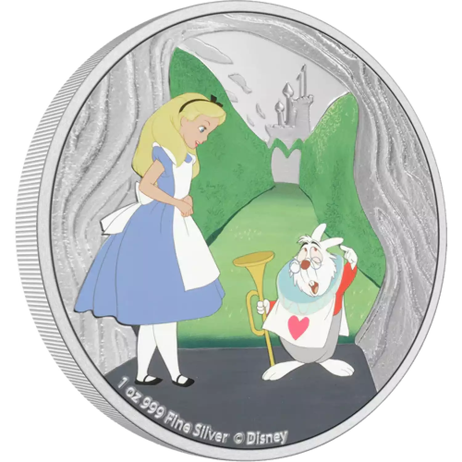 This delightful 1oz pure silver coin celebrates the Disney movie Alice in Wonderland, 1951. It shows a coloured image of Alice with the flighty White Rabbit at the entrance to the Queen of Hearts’ maze. This is offset by a dazzling touch of frosted engraving and background mirror finish. The Ian Rank-Broadley effigy of Her Majesty Queen Elizabeth II can be seen on the obverse.