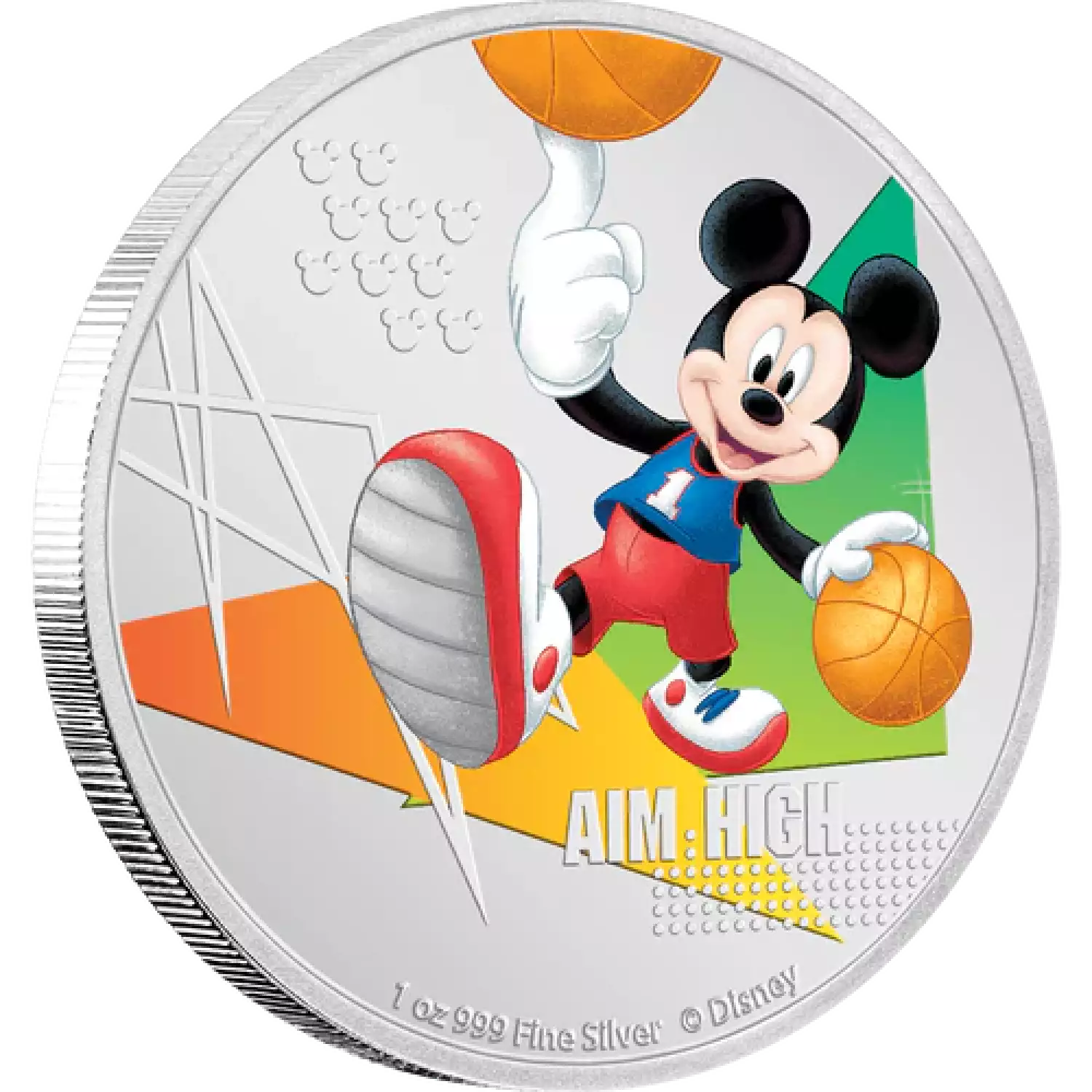 This modern coin shows Disney’s Mickey Mouse in his basketball singlet and hi-tops showing off his ball skills. It’s a 1oz pure silver coin showcasing Mickey in glorious colour. The design is further enhanced by engraved Mickey Mouse symbols and the words “Aim High”. The obverse features the Ian Rank-Broadley effigy of Her Majesty Queen Elizabeth II and the coin is legal tender in Niue.