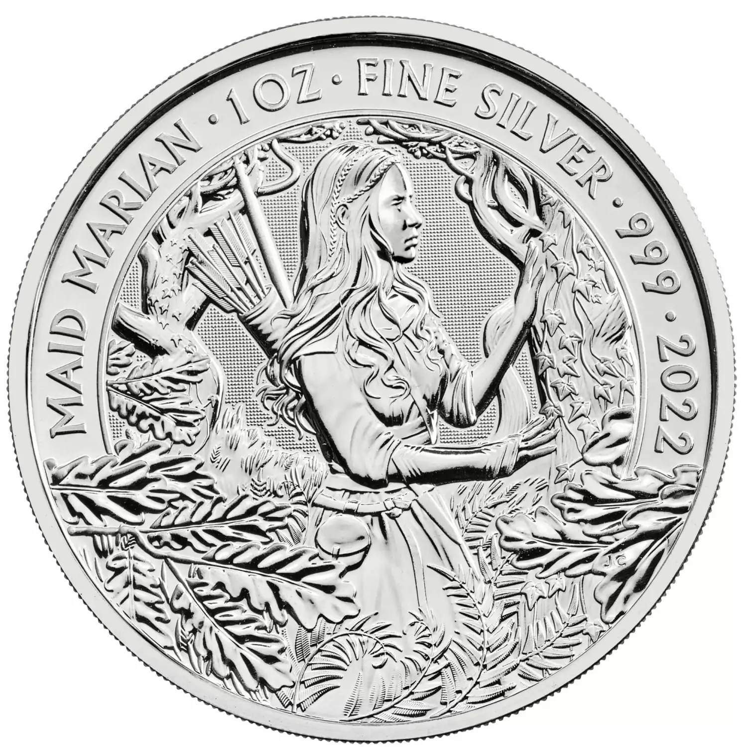 Maid Marian has been depicted in a design by Jody Clark standing watchful amongst the greenery of Sherwood Forest, stealthily observing through the trees with a bow and a quiver of arrows on her back, poised for action. Struck in 999 fine silver, each one ounce coin is finished to The Royal Mint’s bullion standard, and is also available as a one ounce gold edition.