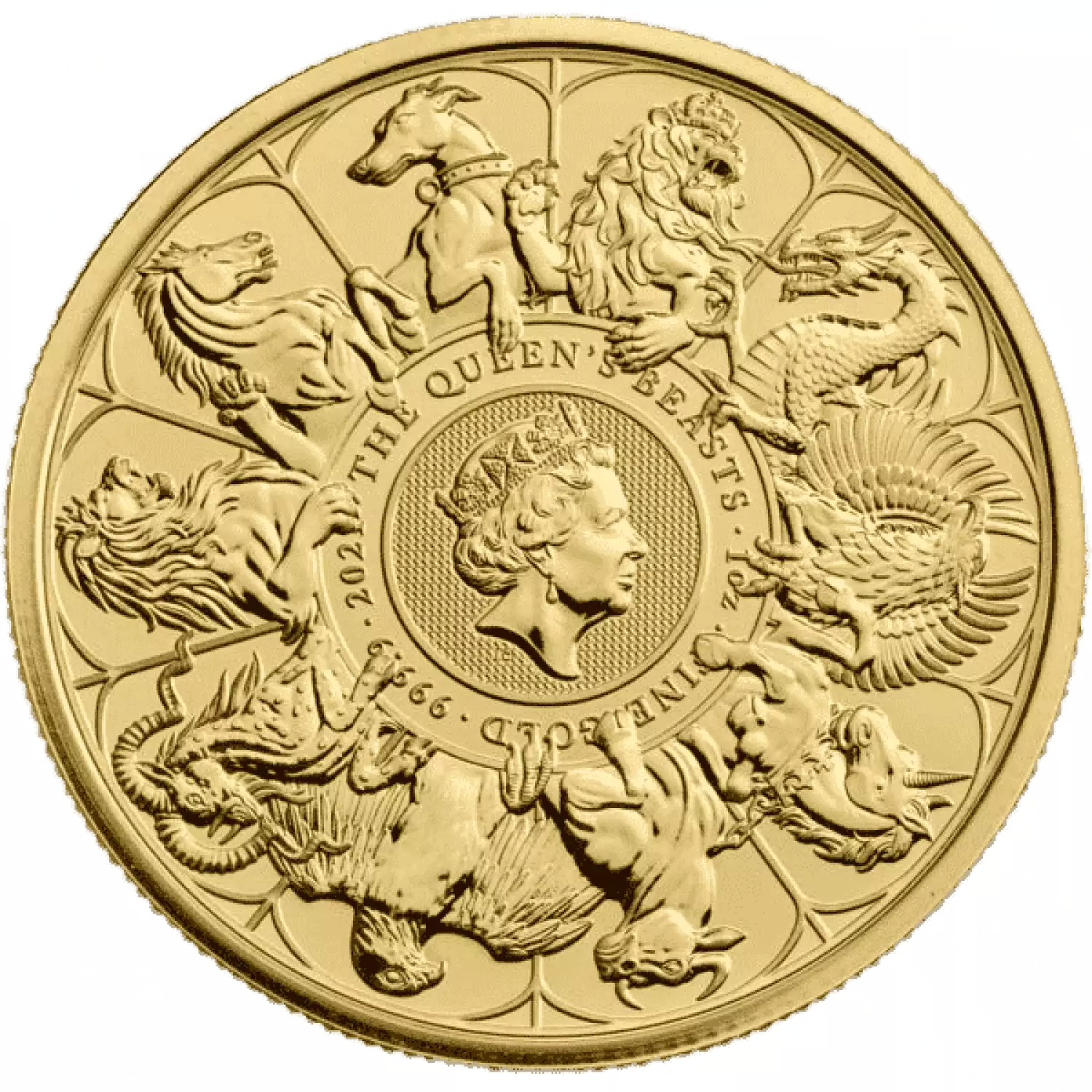 The reverse features all 10 of the Queen's Beasts that appeared in the series surrounding a small version of the Queen's portrait, as well as the inscription, "2021 • THE QUEEN'S BEASTS • 1 oz • FINE GOLD • 999.9. The initials of the artist Jody Clark appear just below the portrait.