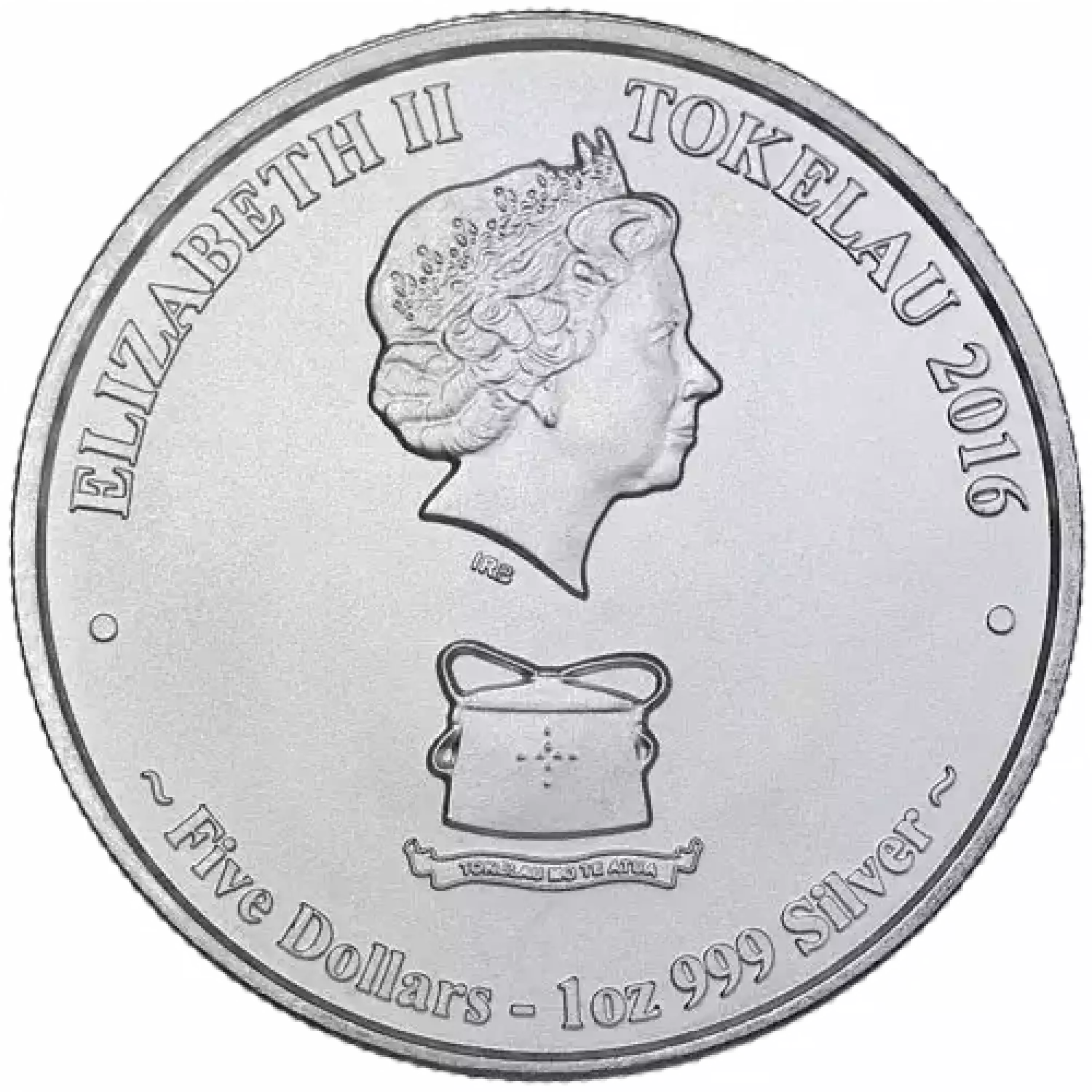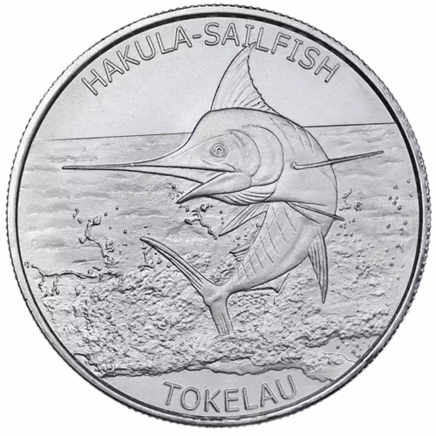 On the reverse face of the 2016 1 oz Tokelau Silver Sailfish Coin you’ll find the image of a sailfish as it flies up out of the warm waters of the Pacific Ocean. Engravings on this face include Sailfish, and the local dialect name of Hakula. “Tokelau” is engraved below the design.