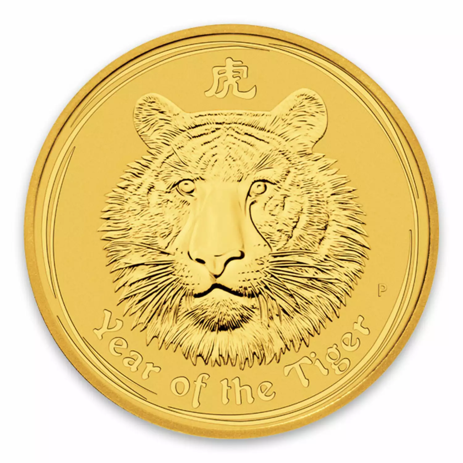 The 2010 2 oz Australian Perth Mint Gold Lunar II: Year of the Tiger contains 2 oz of .9999 actual gold. The Obverse of the coin features the Ian Rank-Broadley likeness of Her Majesty Queen Elizabeth II. The Reverse displays a tiger’s head and the Chinese character for "tiger" with the Perth Mint’s traditional “P” mintmark.