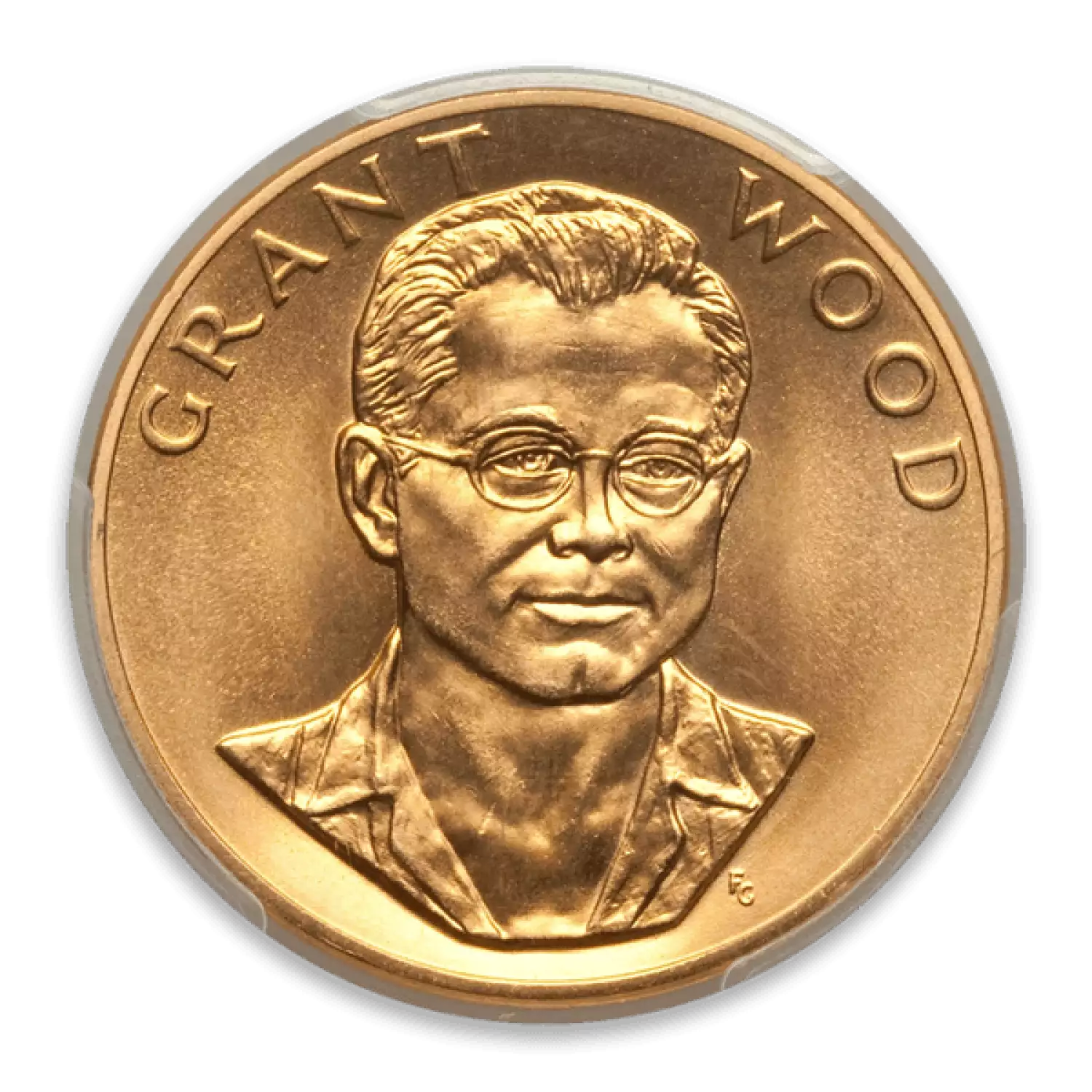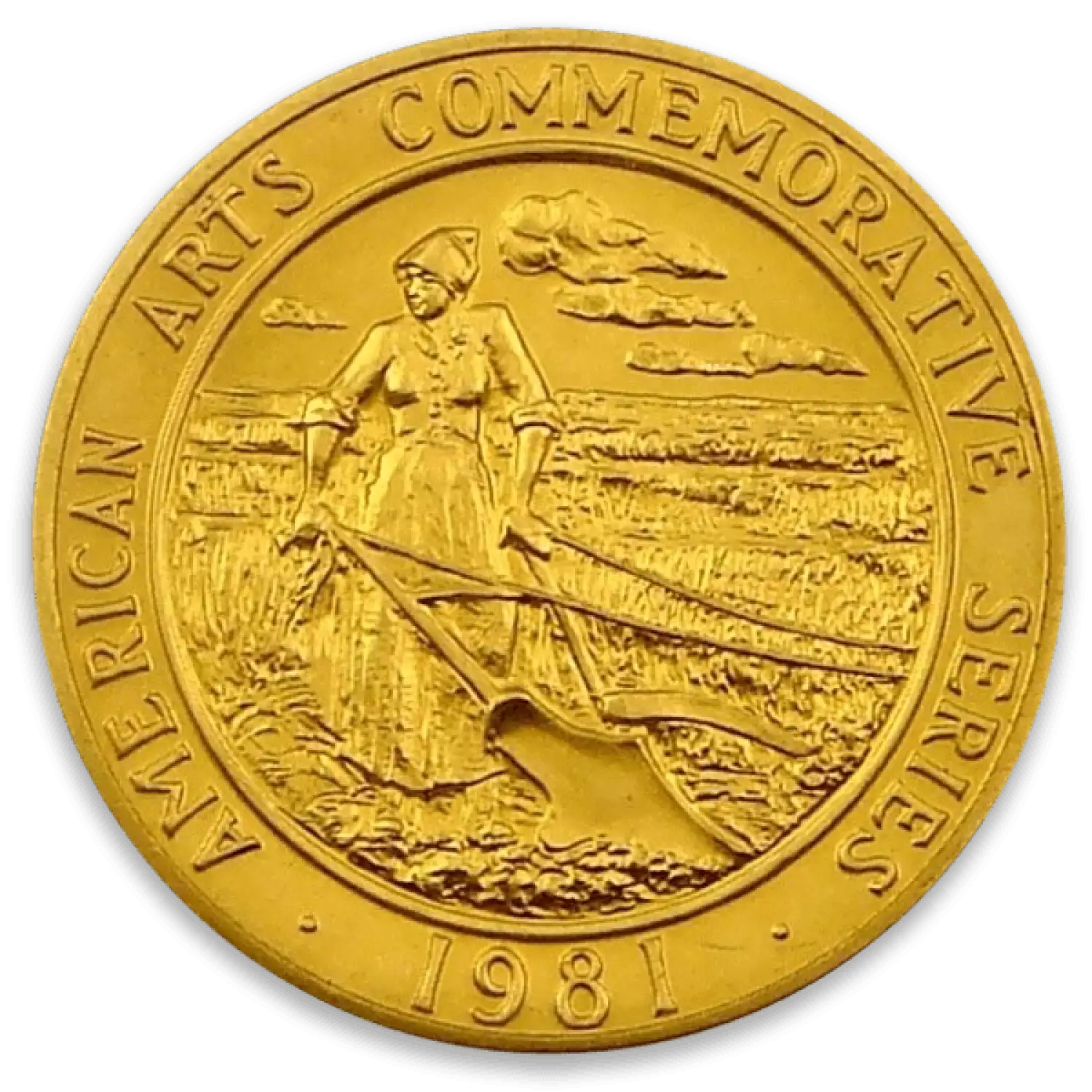 The American Gold Art Medallion 1oz was produced by US Mint and is composed of 1 troy ounce of .900 fine silver.The obverse of the coin features a different featured American artist each year. The reverse of the coin highlights each of the artist's achievement.The value of American Gold Art Medallion 1oz is primarily driven by the spot gold price at any given time.