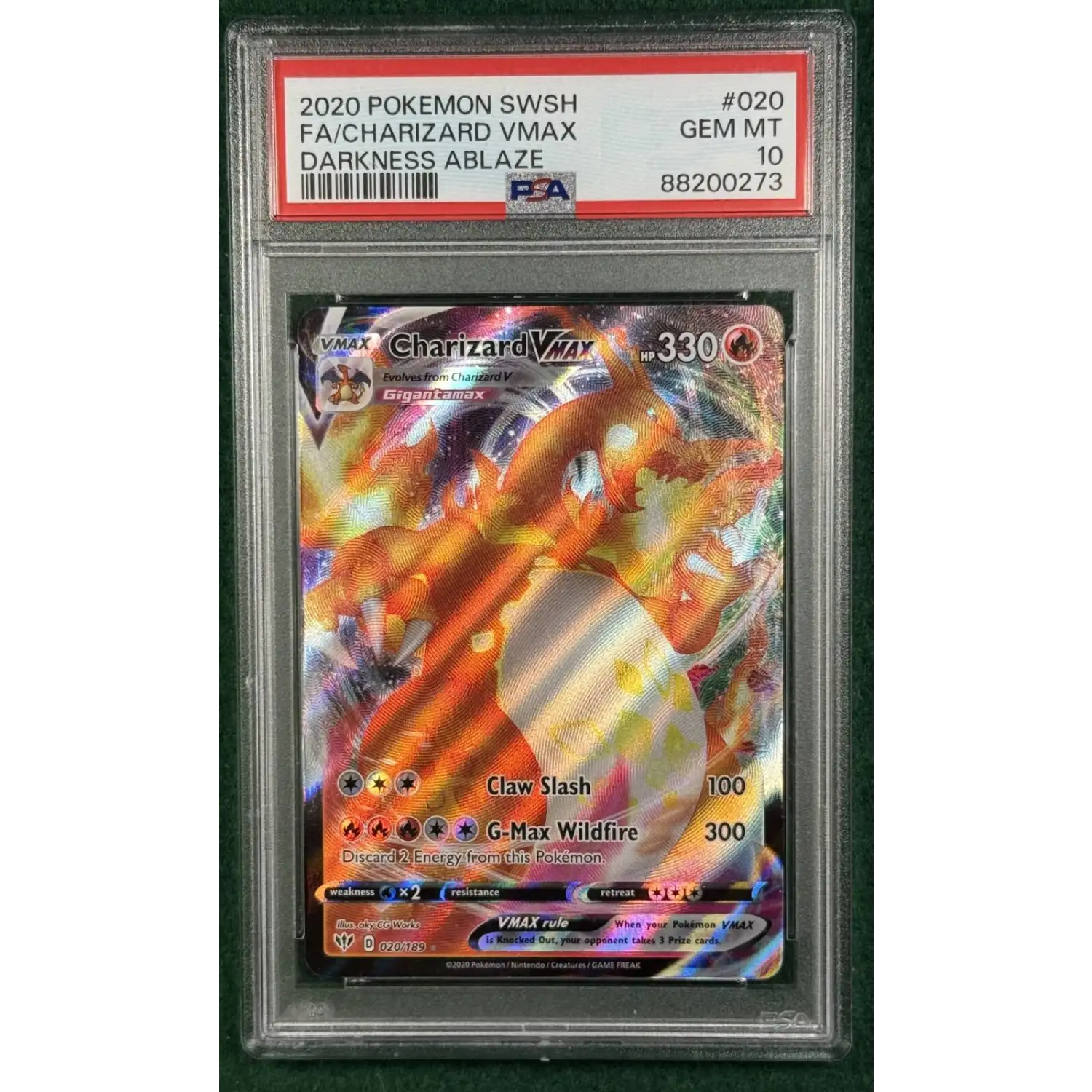 2020 Pokemon SWSH FA/Charizard VMAX Darkness Ablaze #020/189 PSA 10