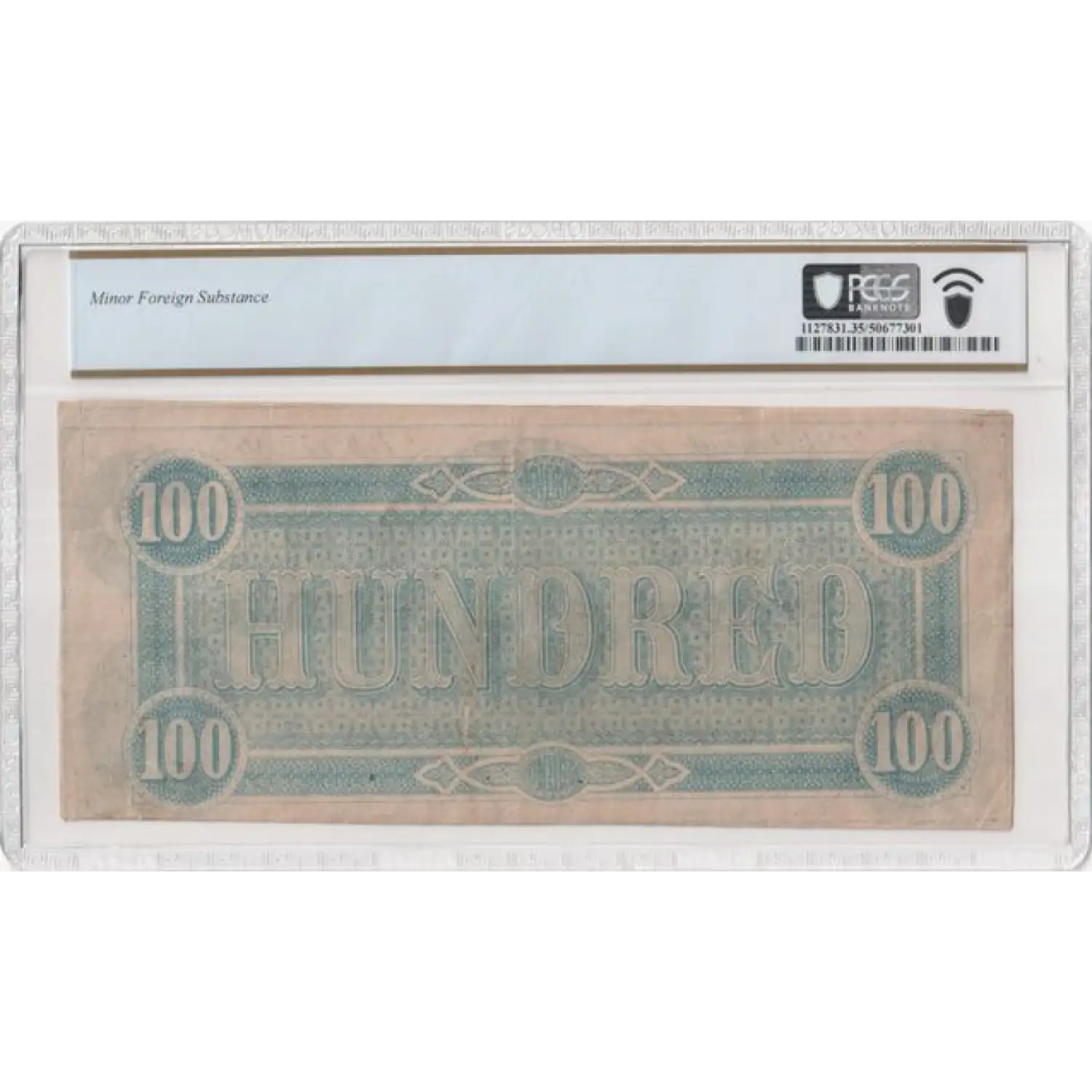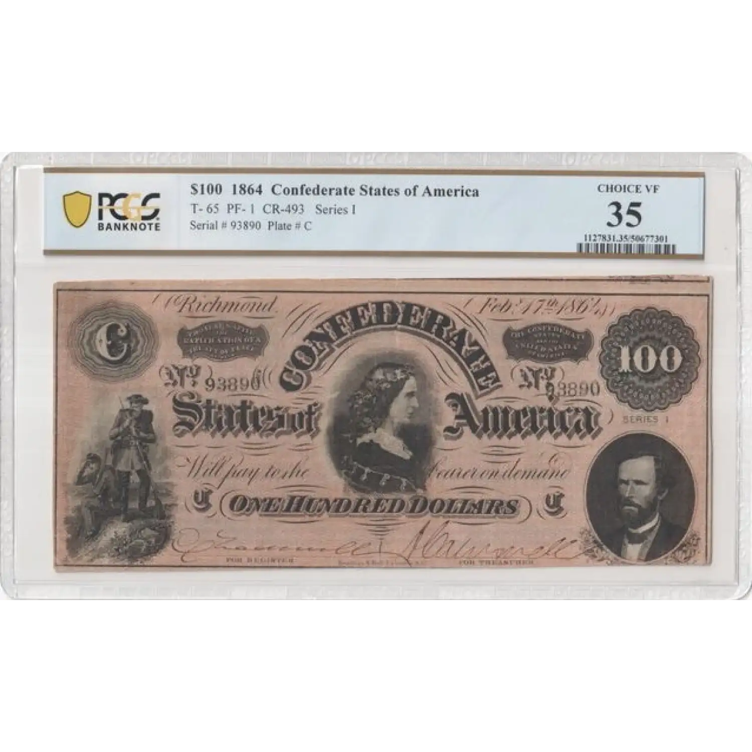 $100 1864 Confederate States of America T-65 PF-1 CR-493 Series I Serial # 93890 Plate # C PCGS 35 Choice VF