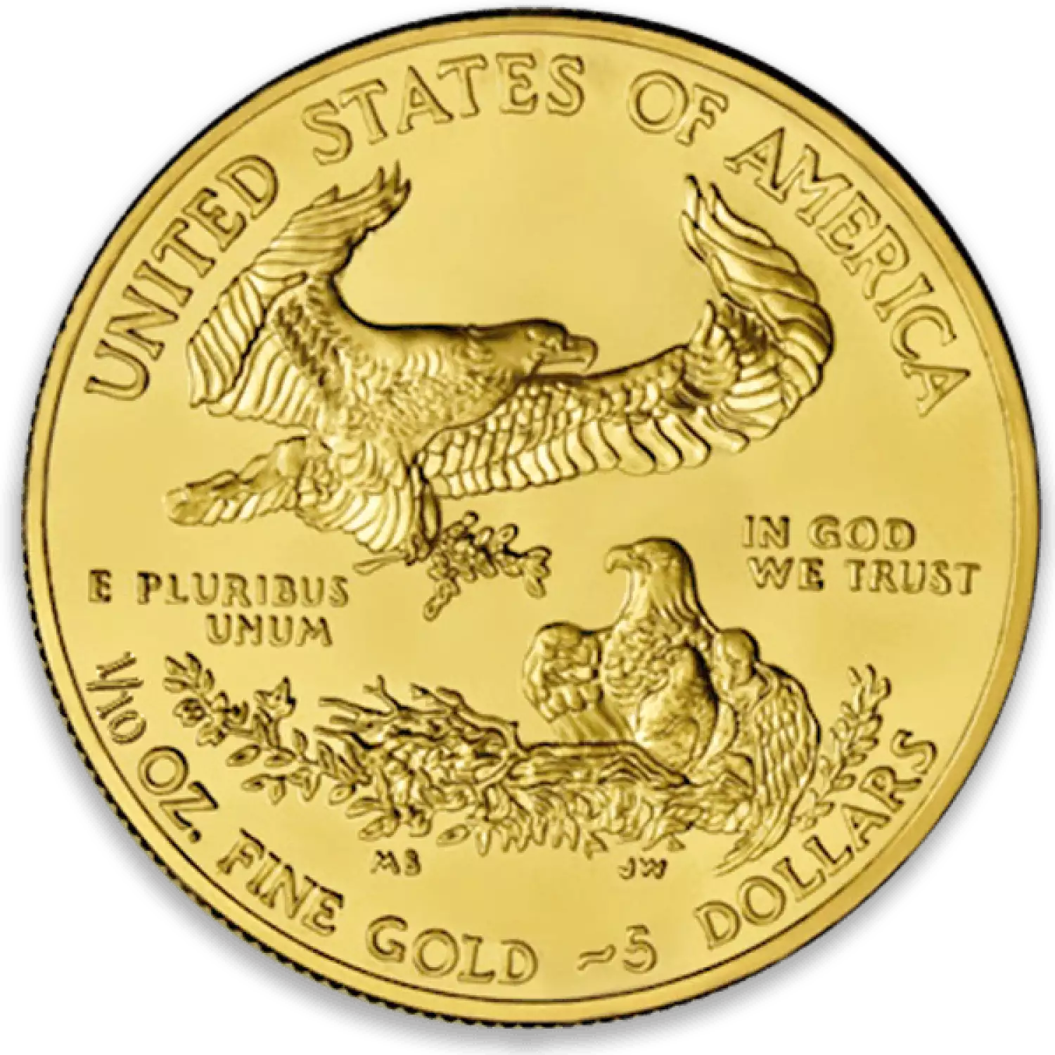 The American Gold Eagle is one of the official Gold Bullion Coin of the United States Mint. These 5 dollar US eagle coins are guaranteed by the U.S. government to contain 1/10 oz (troy ounce, sometimes shown as ozt) of fine gold. The American Eagle 1/10 ounce gold coin is the most popular gold coin in the United States and is made to 0.9167 purity (22kt). Premiums as a percentage of the overall price for fractional gold coins are higher than that of larger coins due to a relatively fixed cost of production.